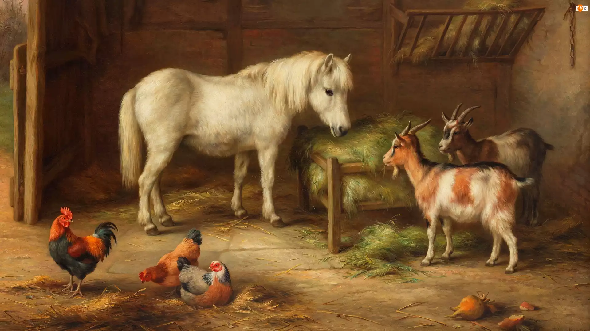 Obraz, Edgar Hunt, Stodoła, Malarstwo, Kury, Kozy, Koń