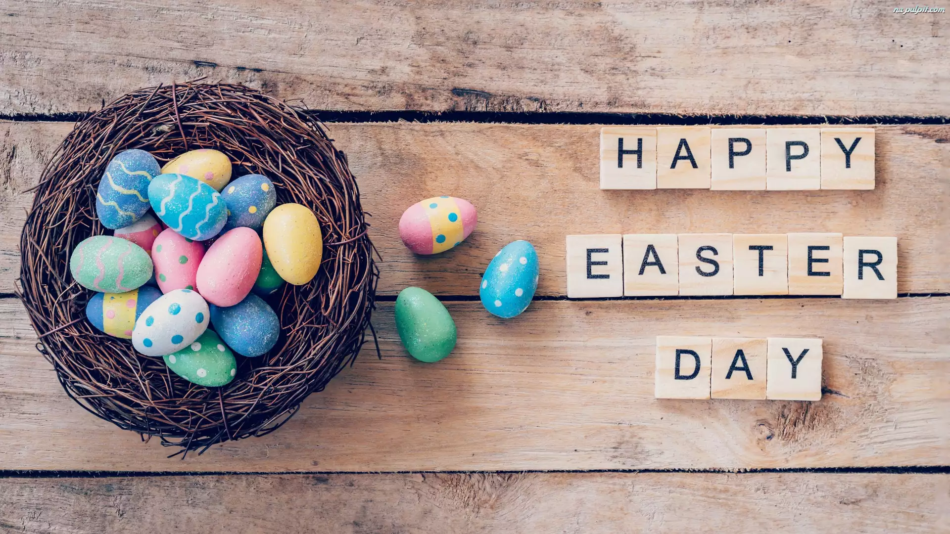 Gniazdo, Pisanki, Deski, Wielkanoc, Happy Easter Day, Napis, Życzenia