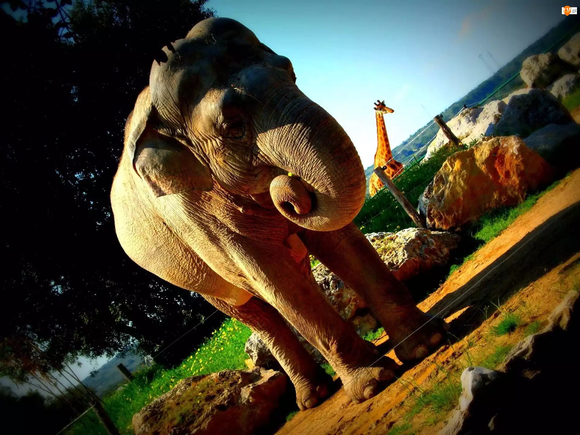 Żyrafa, Słoń, Trawa, Kamienie, Piasek