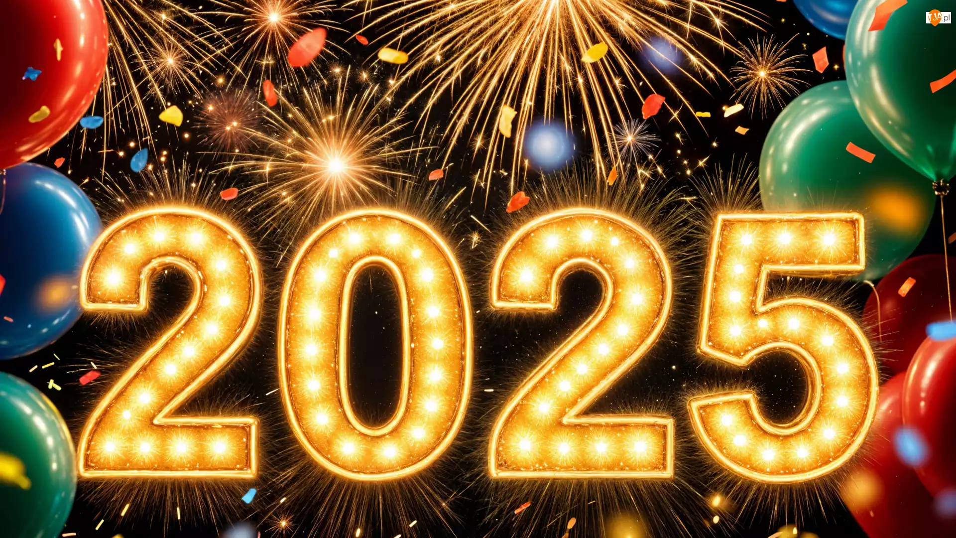 2025, Data, Grafika, Nowy Rok, Balony, Sylwester, Fajerwerki