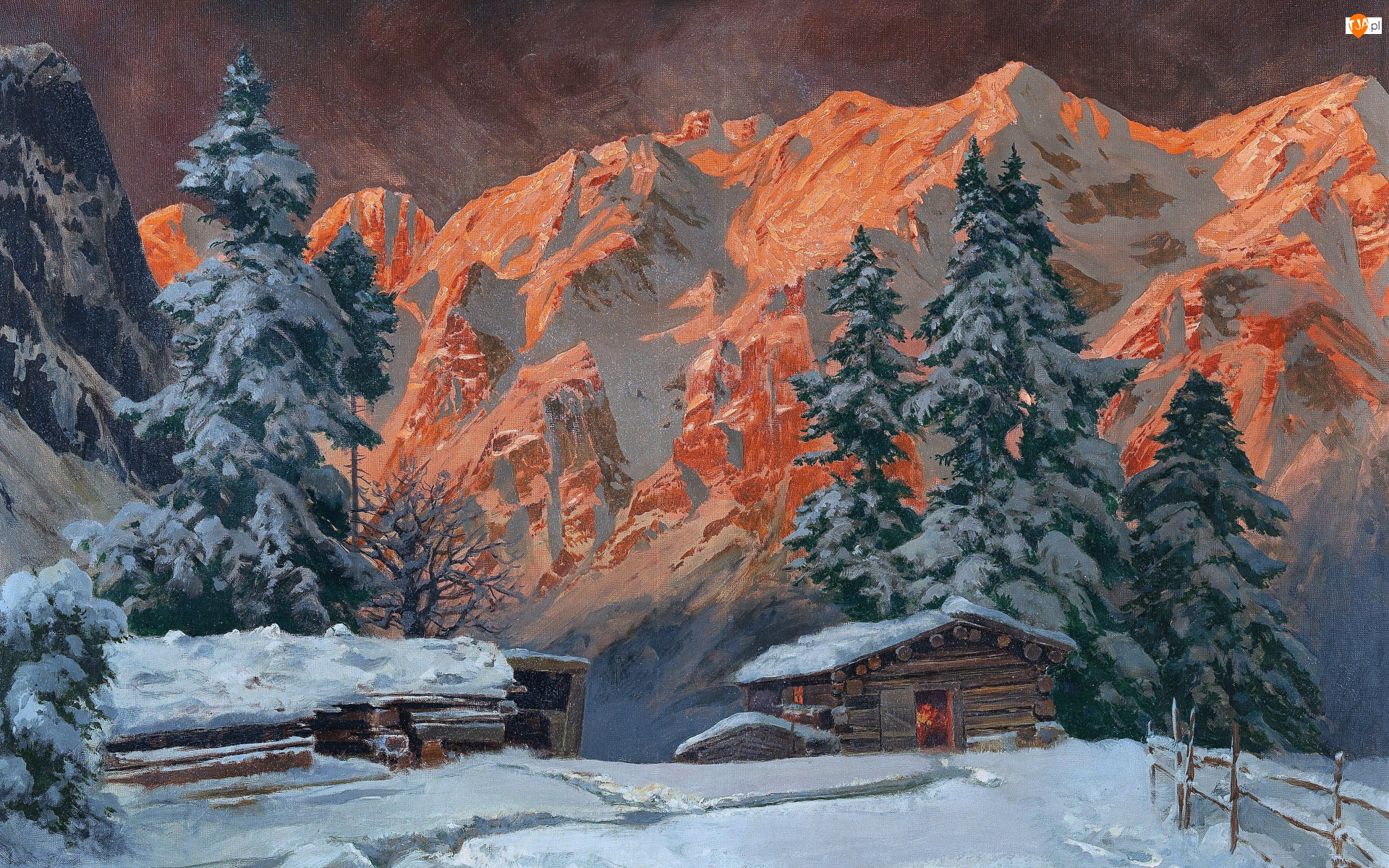 Alois Arnegger, Szopa, Obraz, Drzewa, Malarstwo, Góry, Noc, Dom, Śnieg