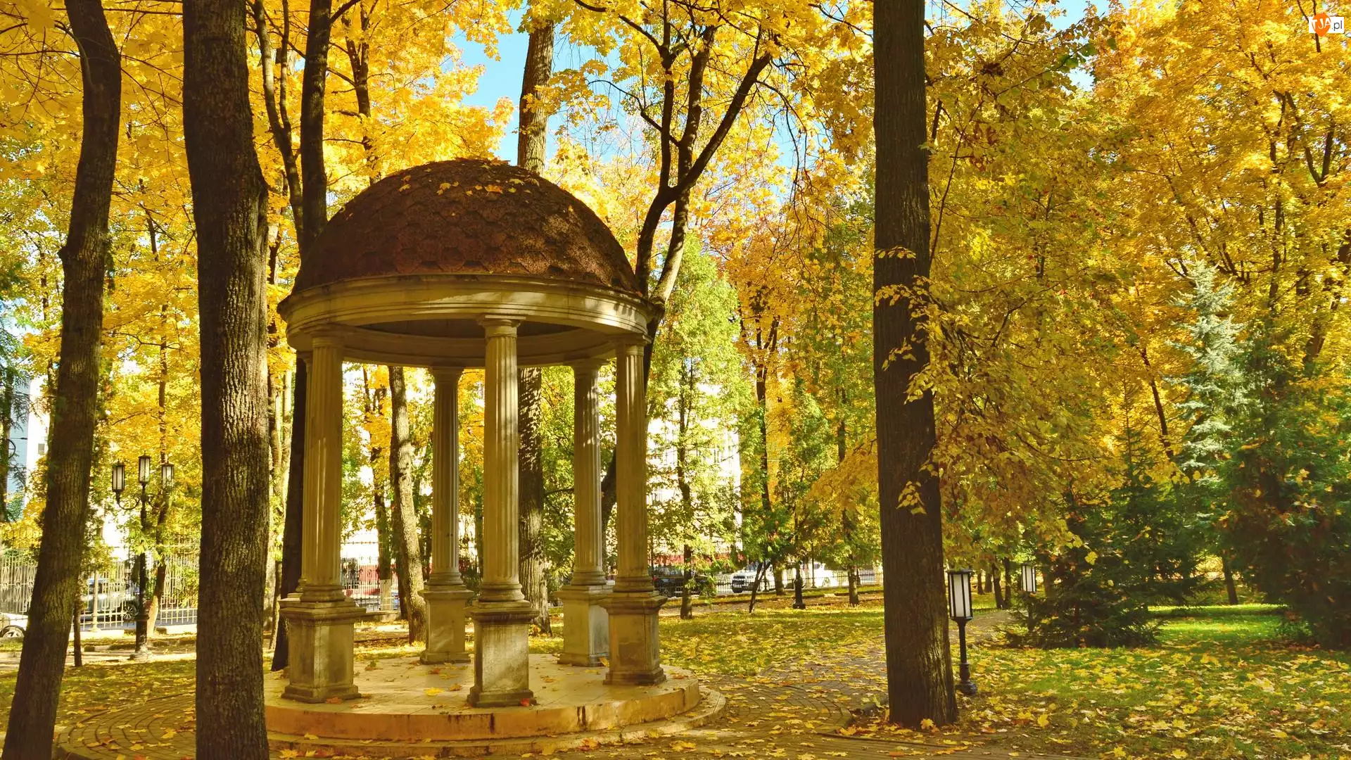 Kolumnada, Drzewa, Altana, Park, Jesień
