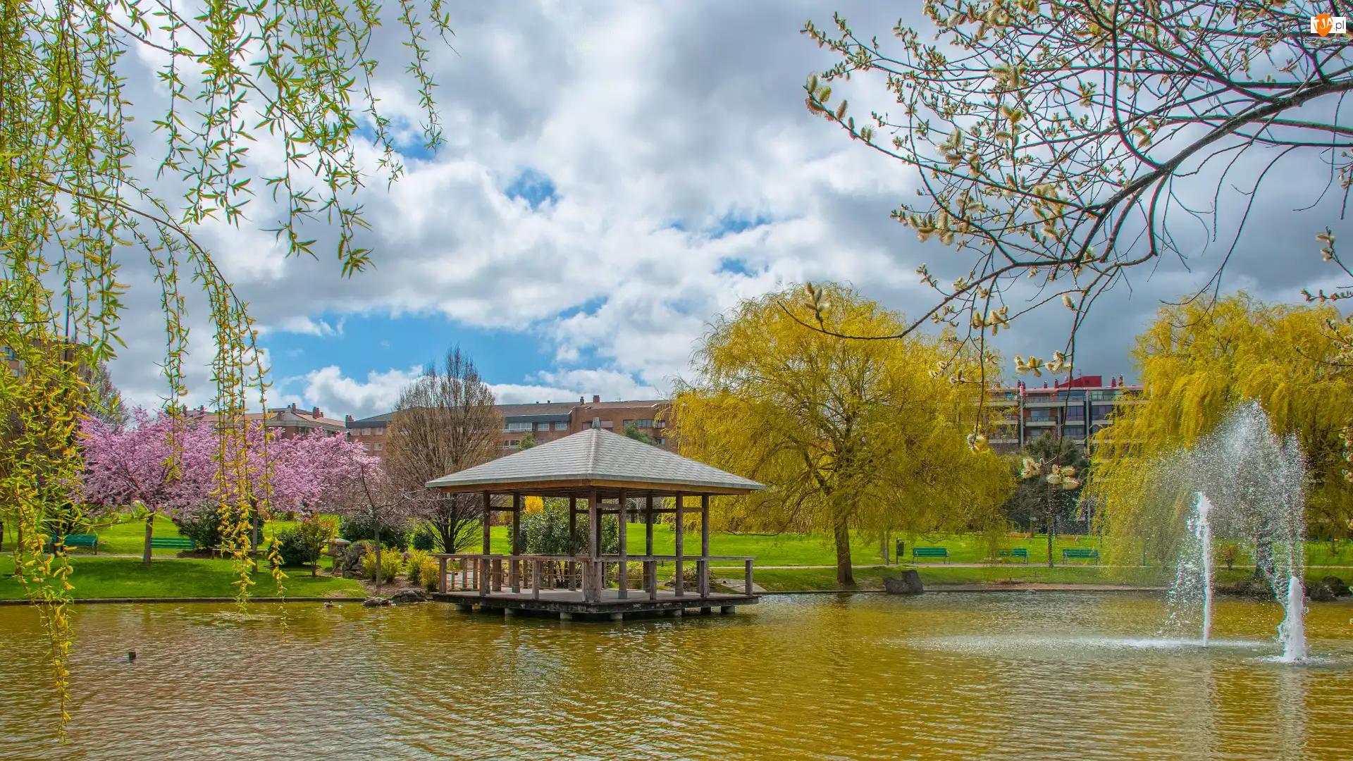 Staw, Park Yamaguchi, Altana, Fontanna, Pampeluna, Drzewa, Wiosna, Hiszpania