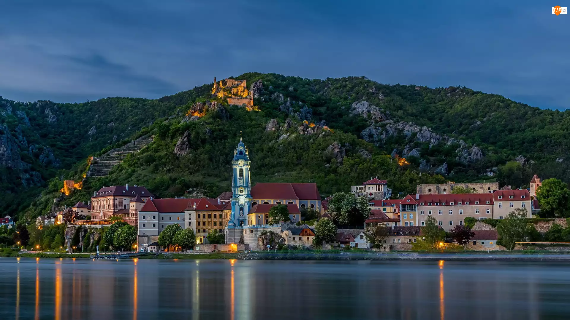 Austria, Rzeka Dunaj, Durnstein, Kościół, Klasztor, Budowle, Domy, Góry, Drzewa