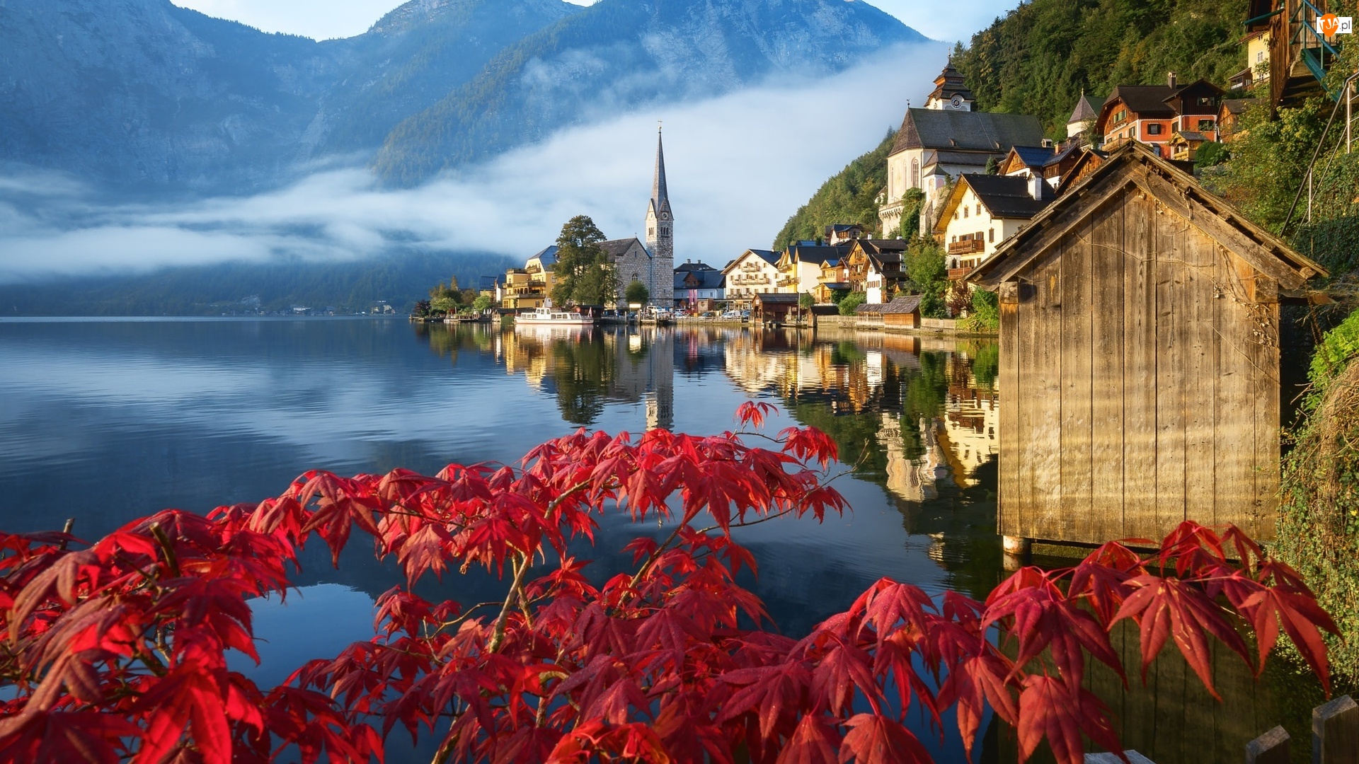 Czerwone, Kościół, Liście, Hallstatt, Domy, Austria, Mgła, Jezioro Hallstättersee, Góry