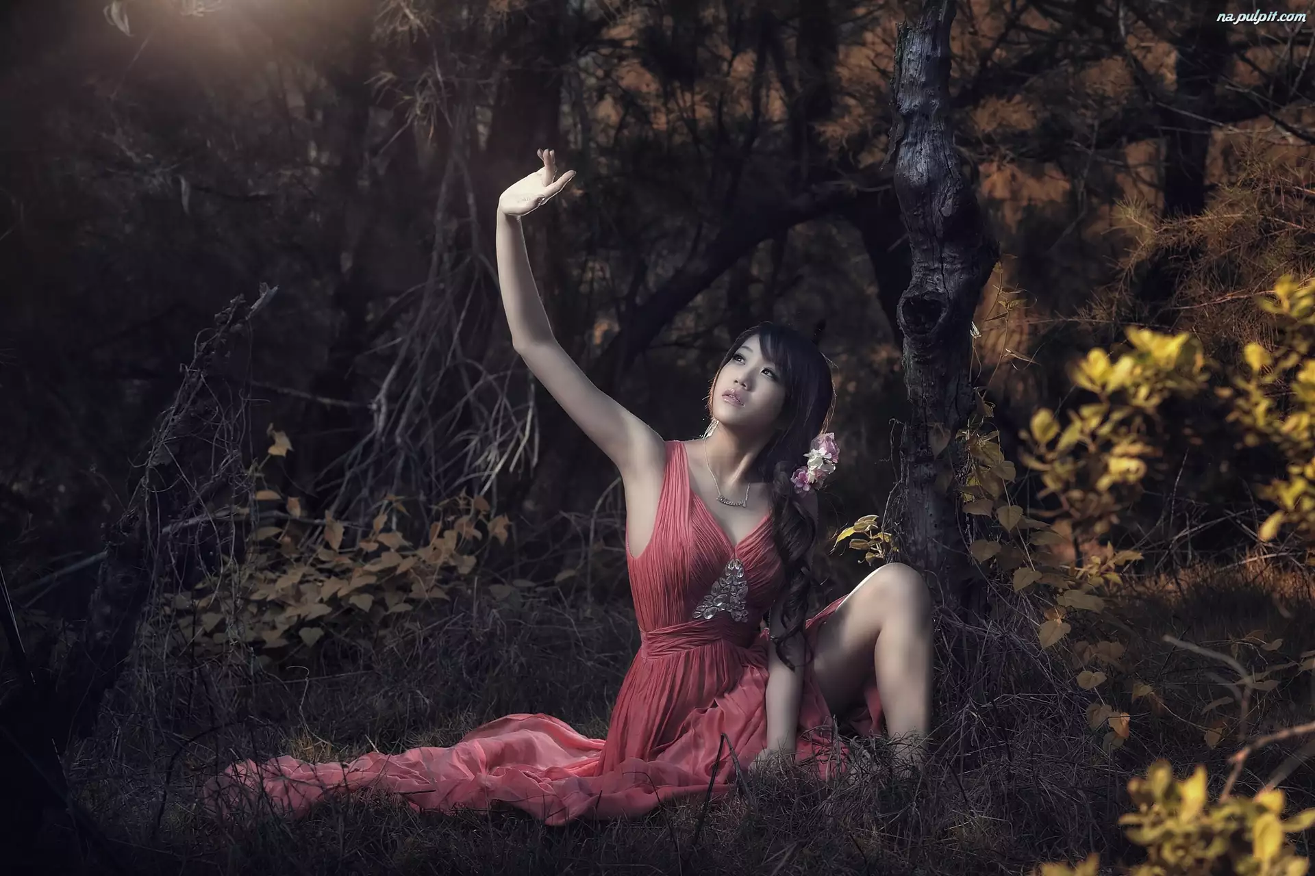 Azjatka, Sukienka, Dziewczyna, Trawa, Czerwona
