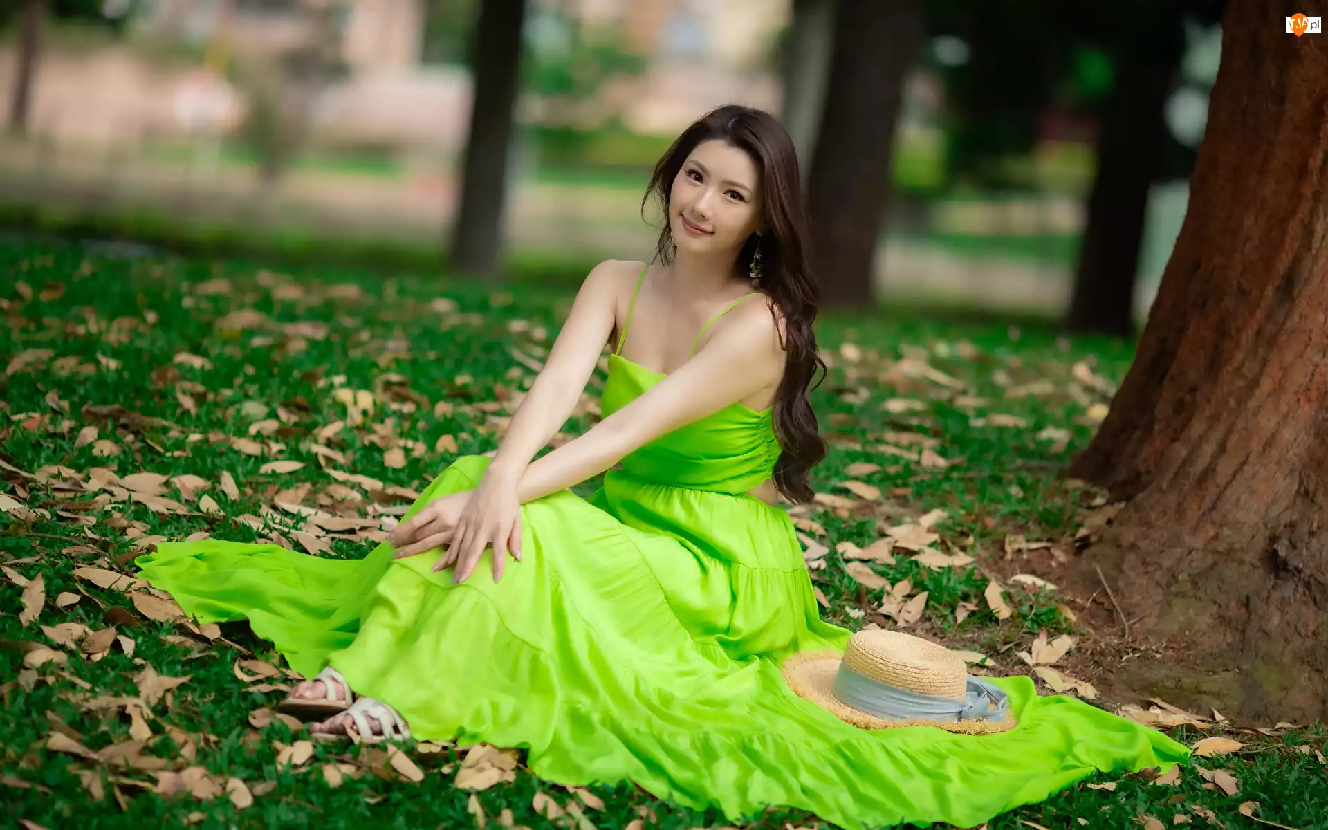 Azjatka, Zielona, Trawa, Kobieta, Drzewa, Kapelusz, Sukienka