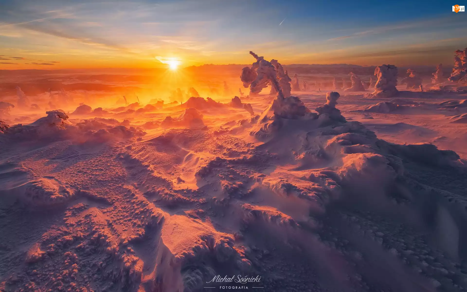 Wschód słońca, Zaspy, Śnieg, Drzewa, Zawoja, Polska, Poranek, Babiogórski Park Narodowy, Ośnieżone, Zima