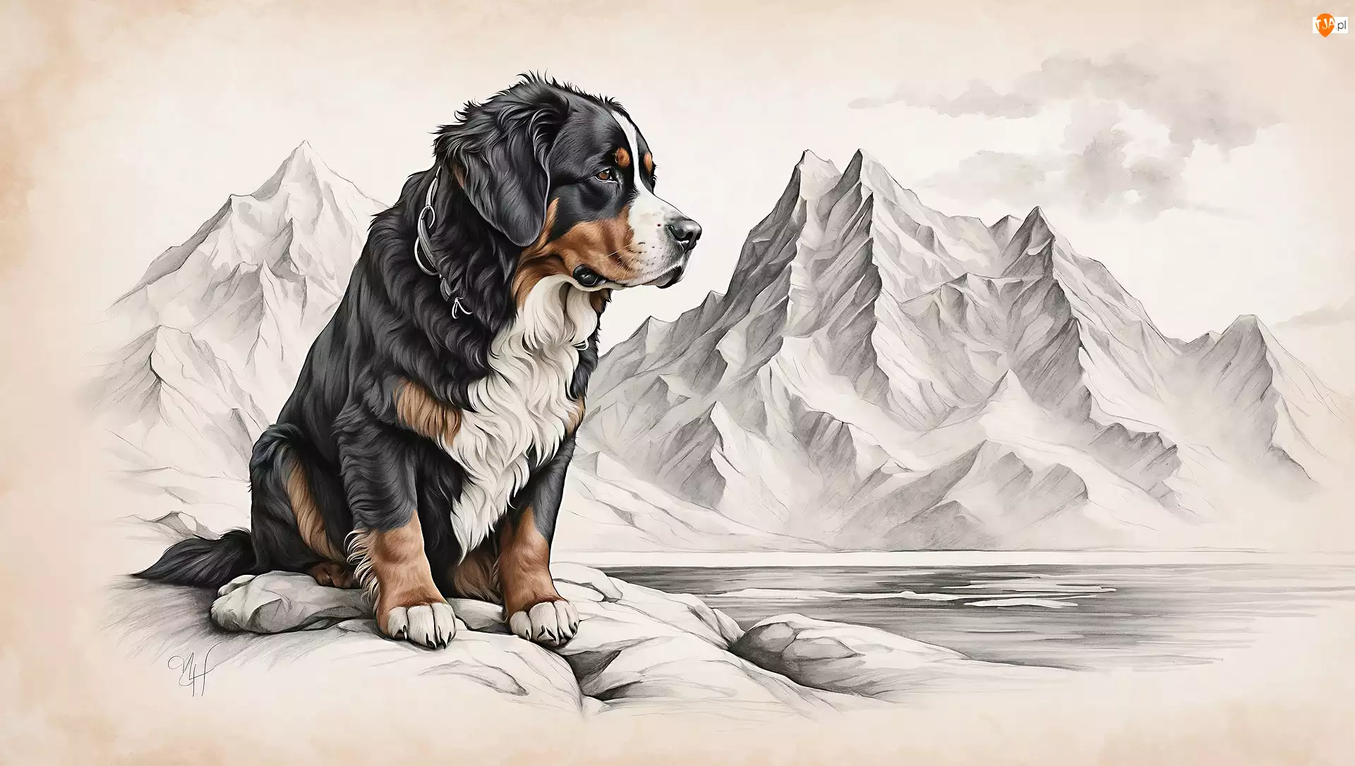 Zima, Rysunek, Berneński pies pasterski, Pies, Góry