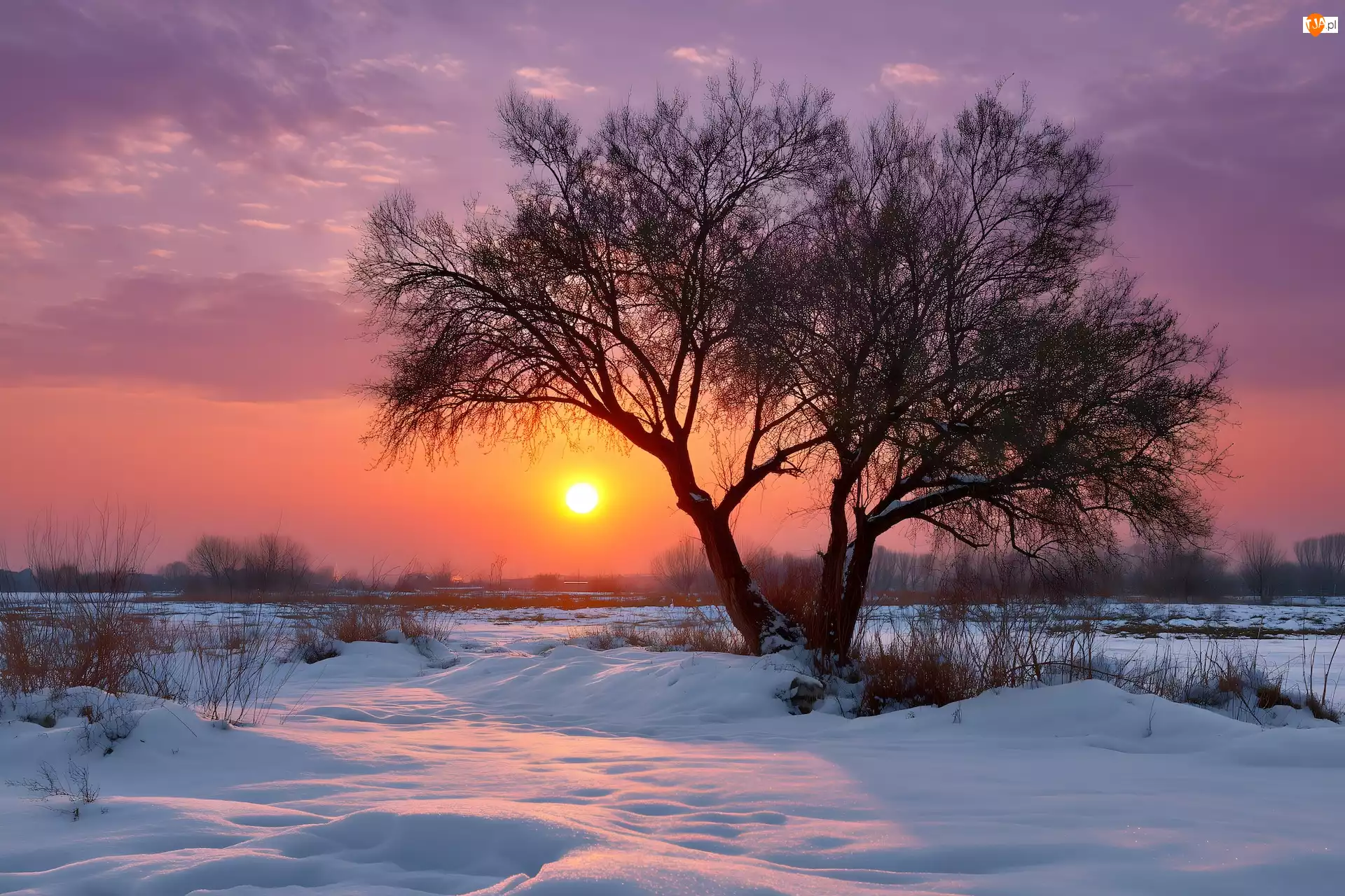 Bezlistne, Zima, Zachód słońca, Drzewo