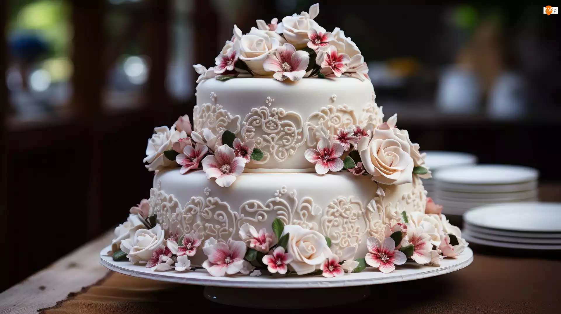 Biała, Tort, Lukrowe, Grafika, Czekolada, Kwiaty