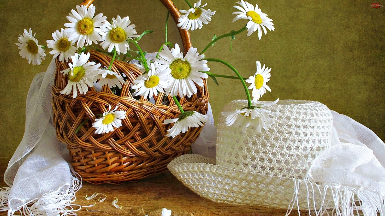 Białe, Kapelusz, Wiklinowy, Szal, Kosz, Margarytki