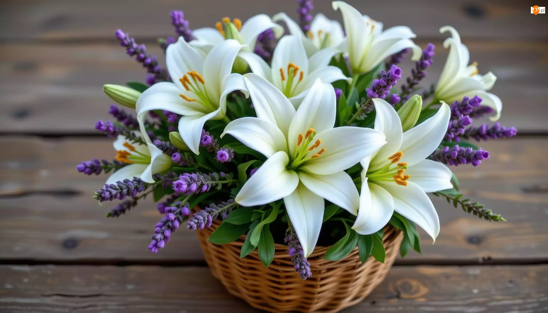 Białe, Lilie, Grafika AI, Kwiaty, Koszyk, Bukiet, Lawenda