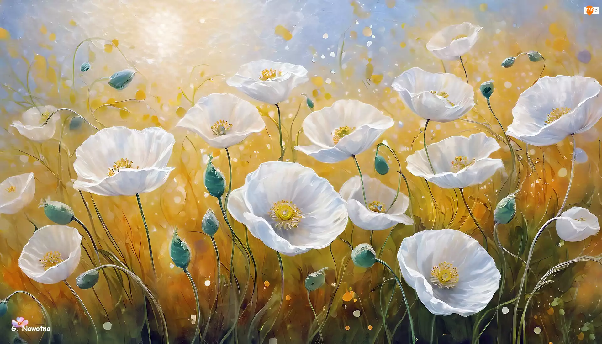 Białe maki z pąkami na żółto-niebieskim tle