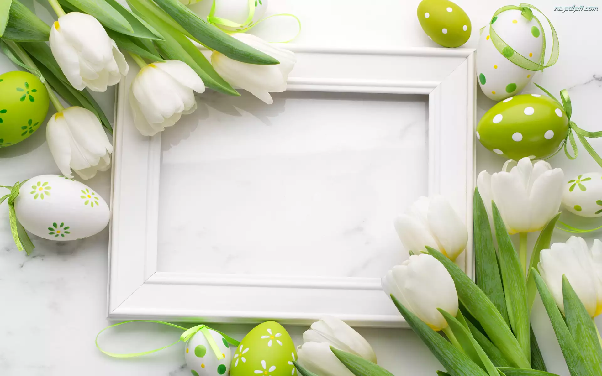 Białe, Wielkanoc, Pisanki, Ramka, Zielone, Tulipany
