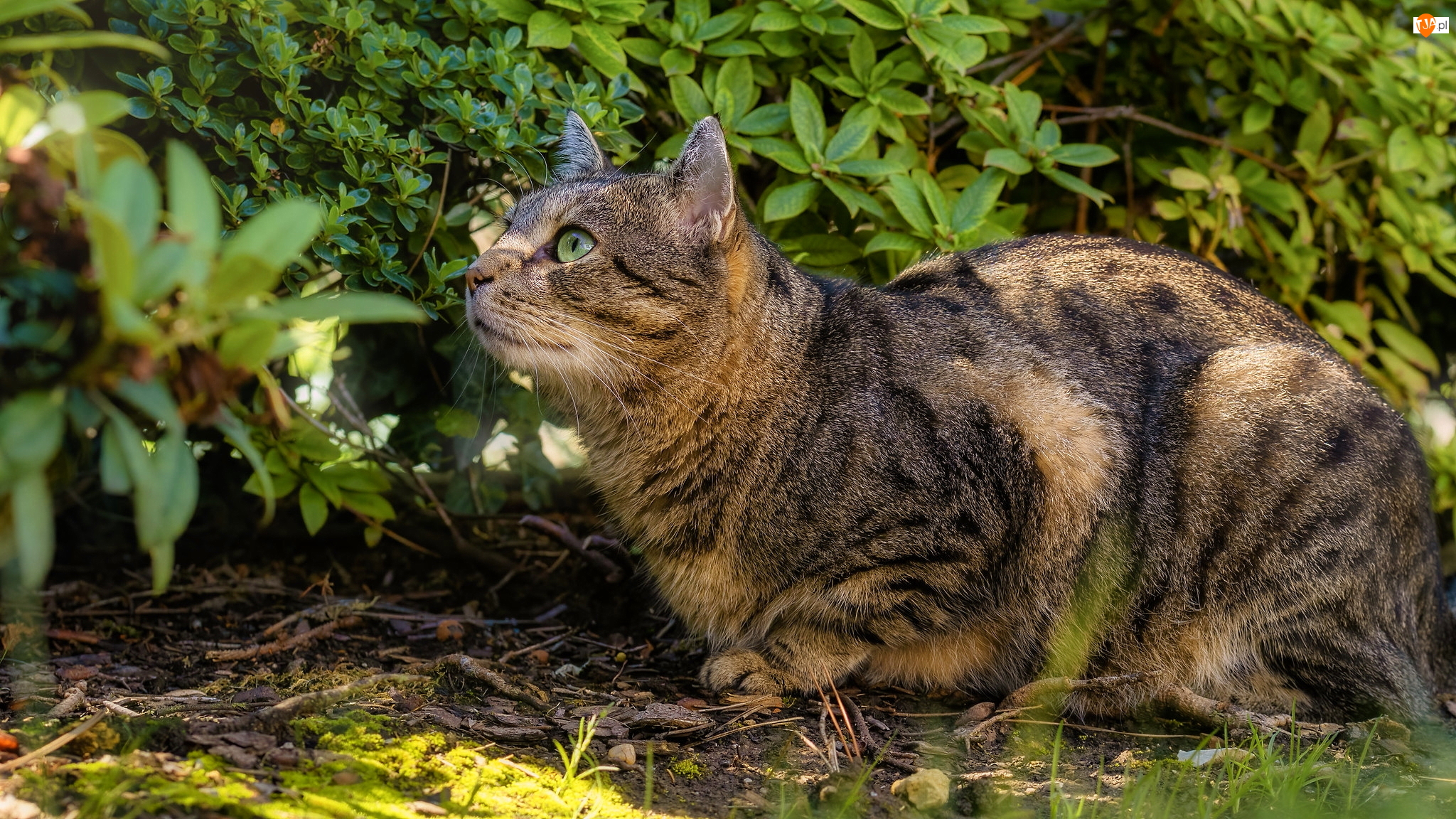 Biry zielonooki kot pod krzewem