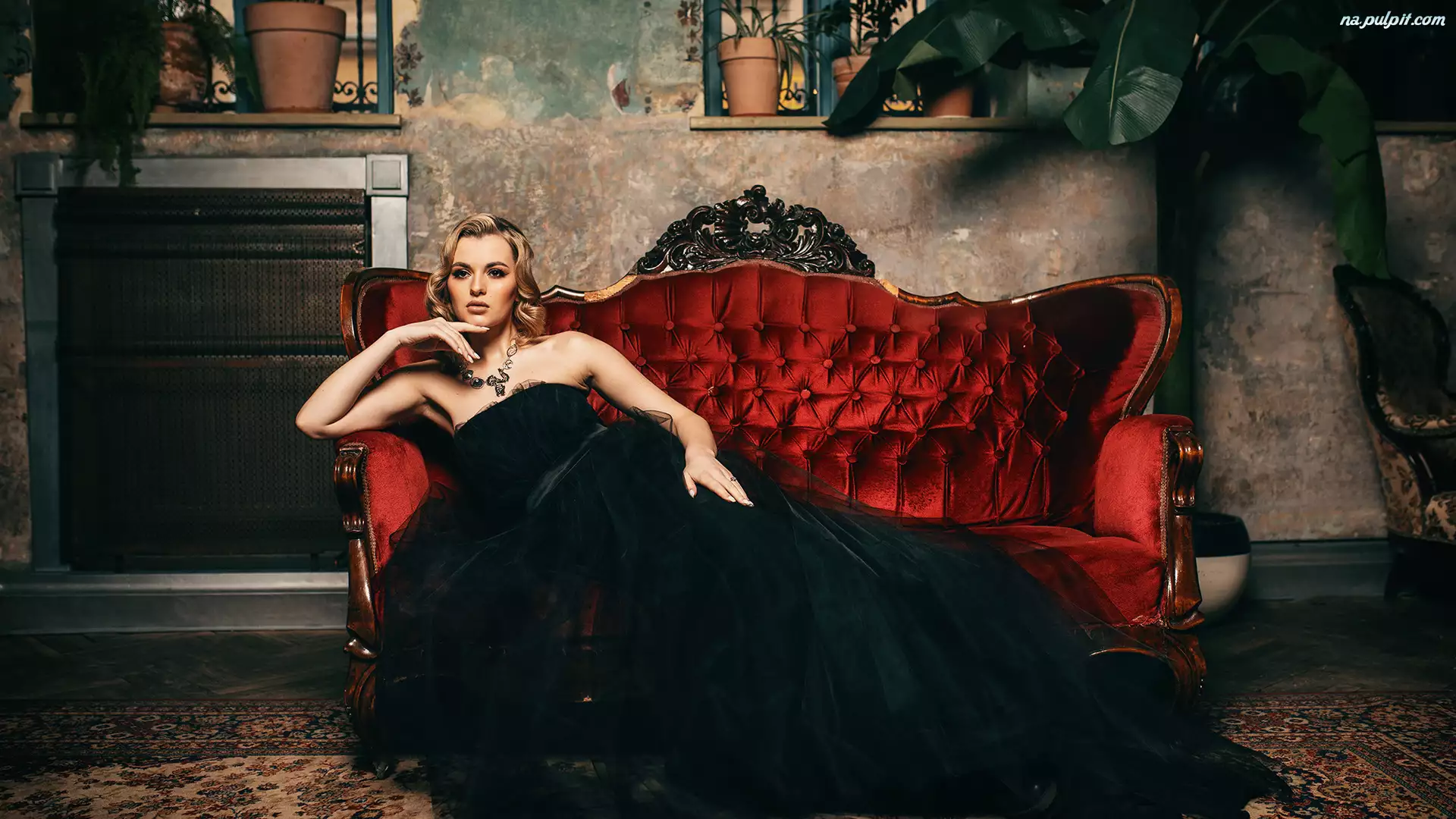 Blondynka, Kobieta, Suknia, Sofa, Czarna, Czerwona
