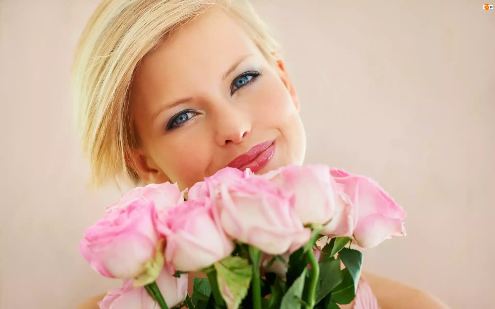 Róż, Blondynka, Uśmiech, Bukiet