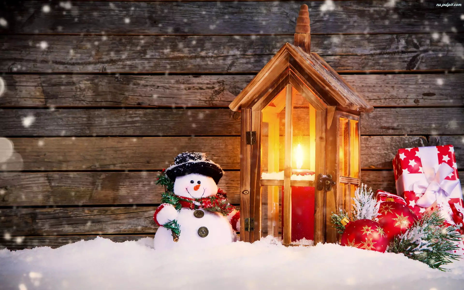 Bombki, Bałwanek, Świąteczna, Kompozycja, Prezenty, Lampion, Świeca
