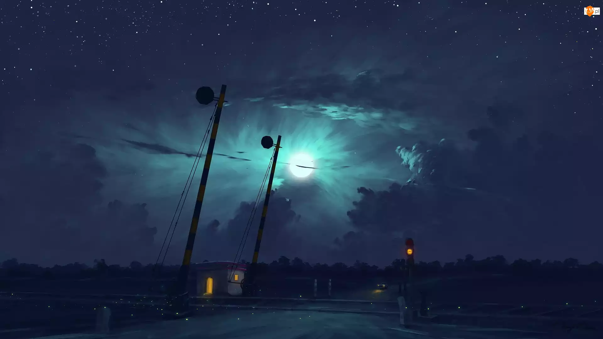Chmury, Noc, Przejazd kolejowo-drogowy, Grafika, Księżyc, Budka dróżnika