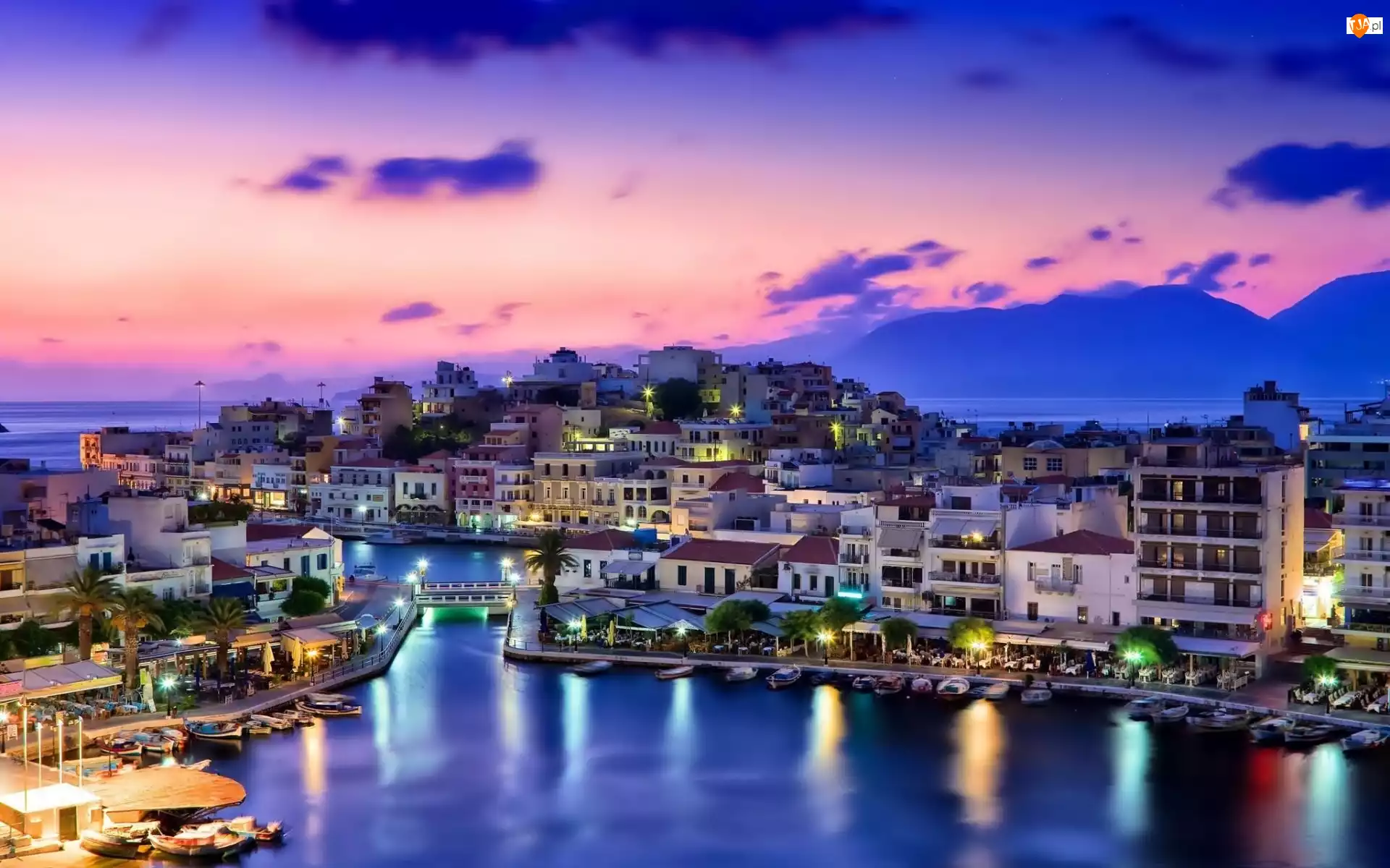 Budynki, Zmrok, Miasteczko, Grecja, Mirabello, Ł