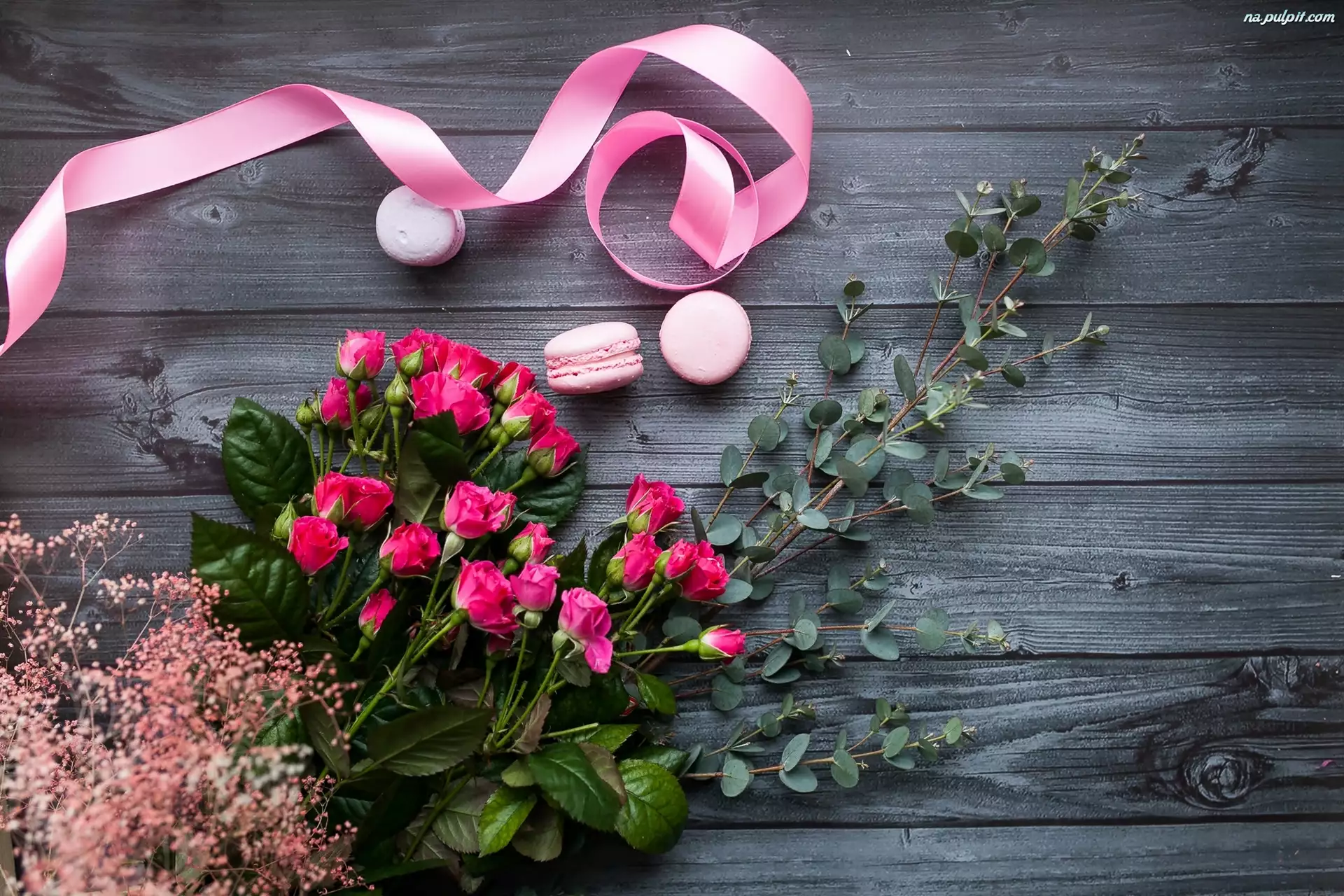 Wstążka, Deski, Róże, Bukiet, Makaroniki
