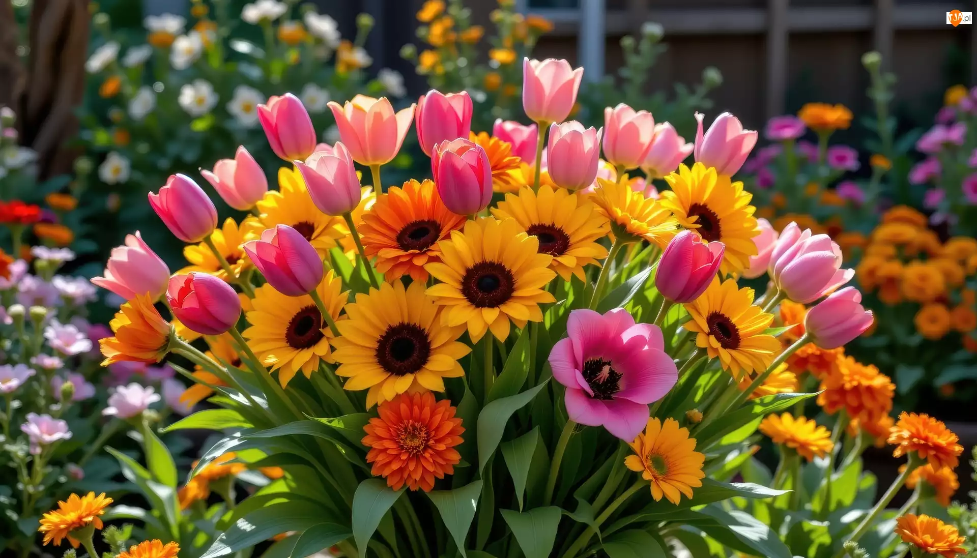 Bukiet, Kwiaty, Tulipany, Słoneczniki