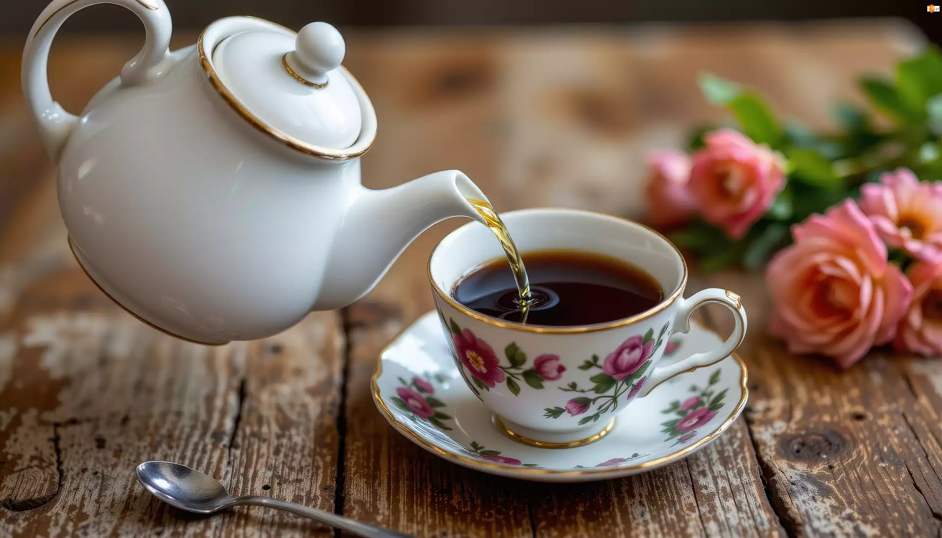Róże, Czajnik, Filiżanka, Herbata