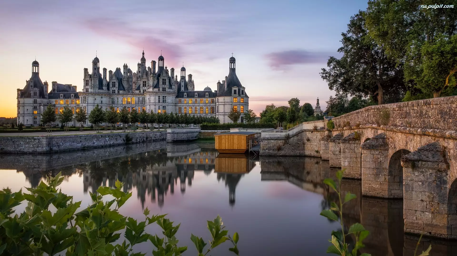 Chambord, Rzeka Cosson, Drzewa, Francja, Most, Chateau de Chambord, Zamek