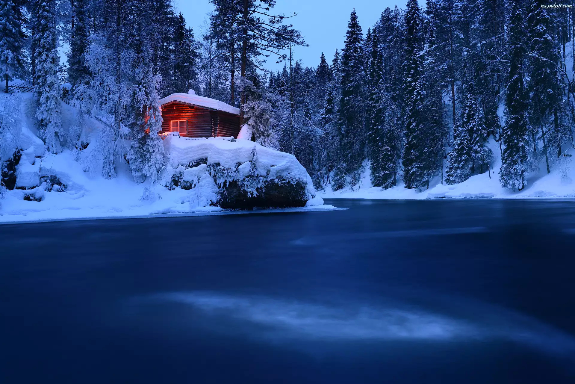 Finlandia, Drzewa, Park Narodowy Oulanka, Chata, Śnieg, Zima, Rzeka, Zmrok, Drewniana, Laponia
