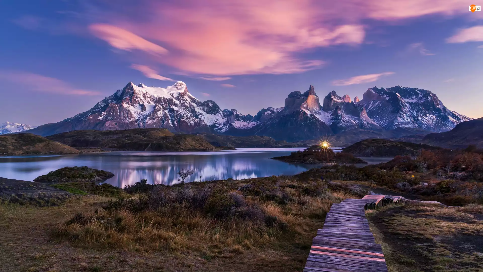 Chile, Ośnieżone, Patagonia, Chmury, Park Narodowy Torres del Paine, Jezioro, Roślinność, Góry, Kładka