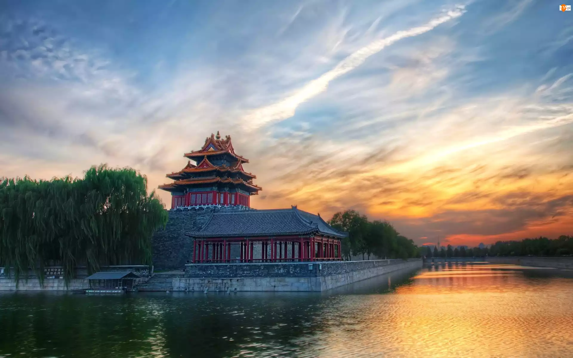 Chiny, Woda, Budynek, Drzewa, Zachód