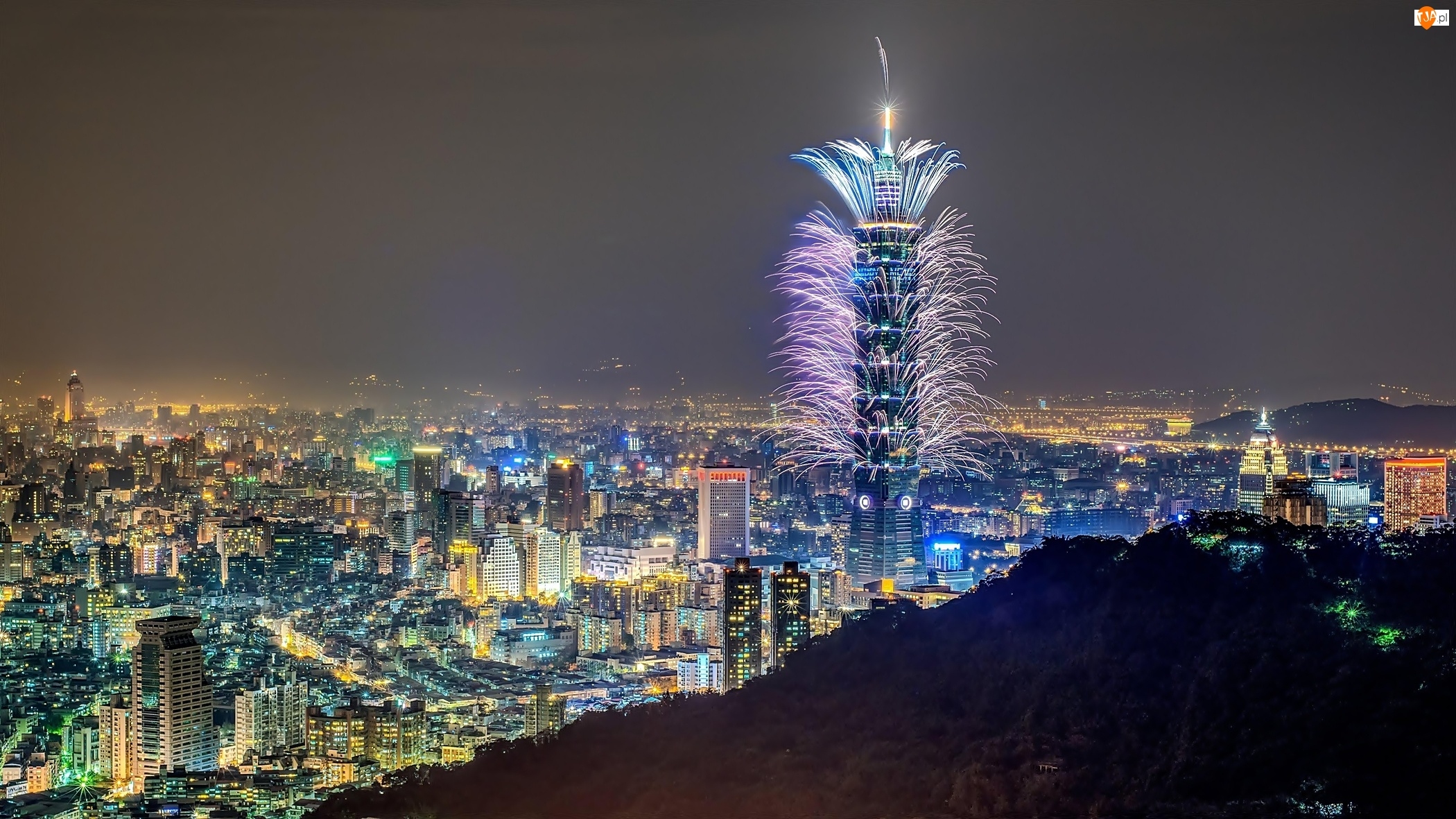 Chmur, Noc, Taipei, Chiny, Fajerwerki, Miasto, Drapacz
