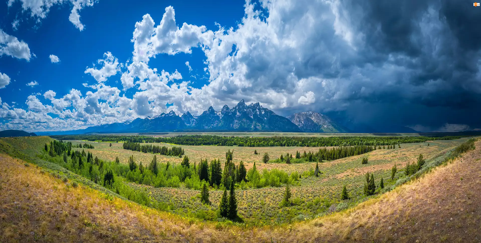 Góry, Stany Zjednoczone, Równina, Chmury, Wyoming, Drzewa, Niebo, Park Narodowy Grand Teton