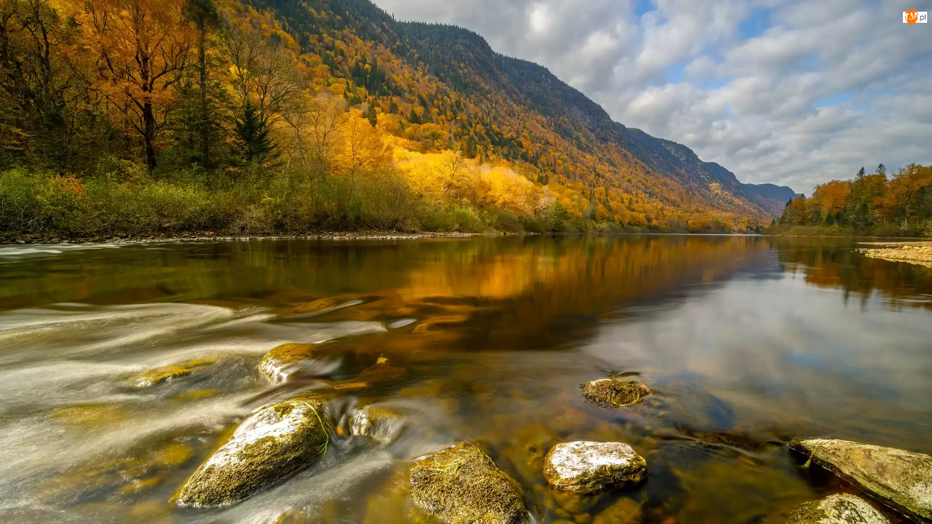 Chmury, Góry, Drzewa, Park Narodowy Jacques Cartier, Rzeka Jacques Cartier, Jesień, Kanada, Kamienie