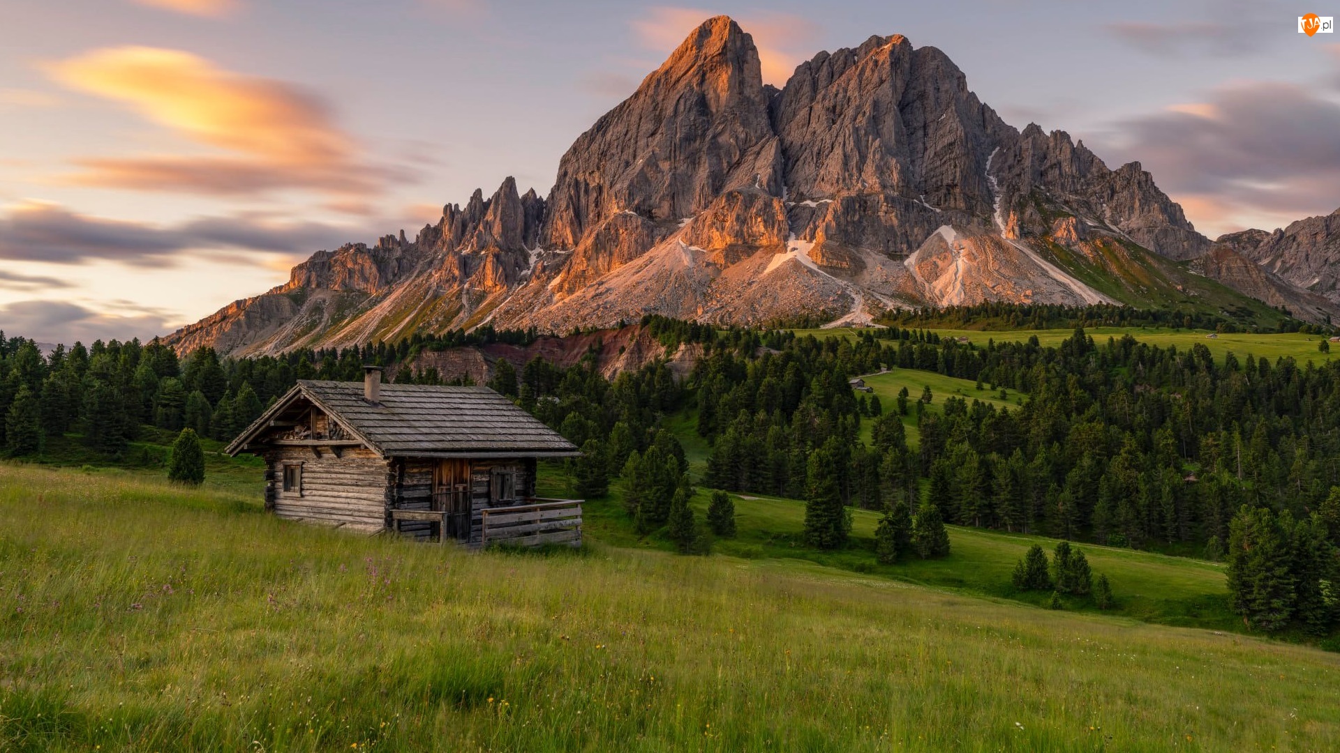 Chmury, Góry, Drzewa, Południowy Tyrol, Góra Peitlerkofel, Dom, Włochy, Dolomity