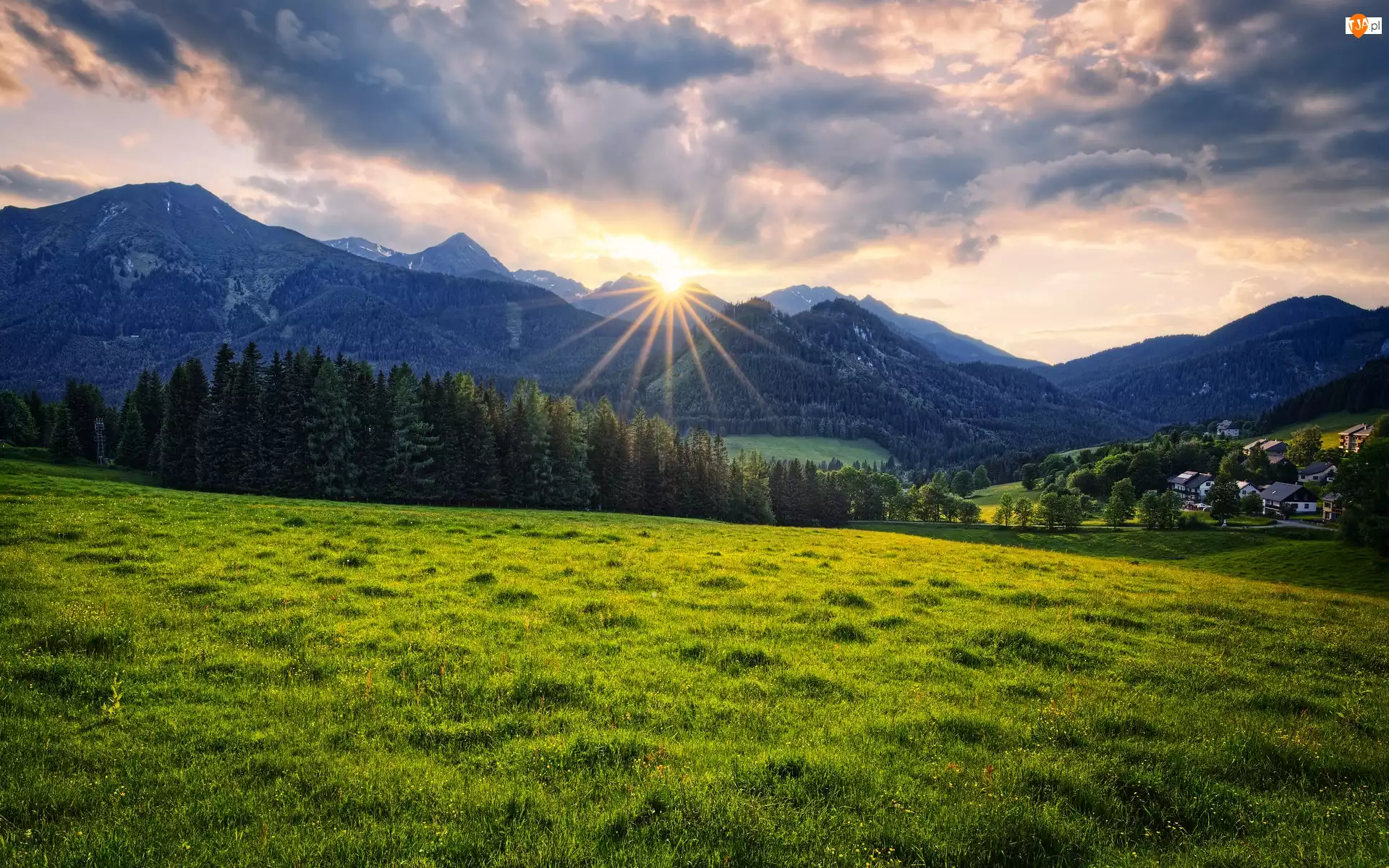 Chmury, Góry, Promienie słońca, Domy, Droga, Niskie Taury, Las, Austria, Drzewa