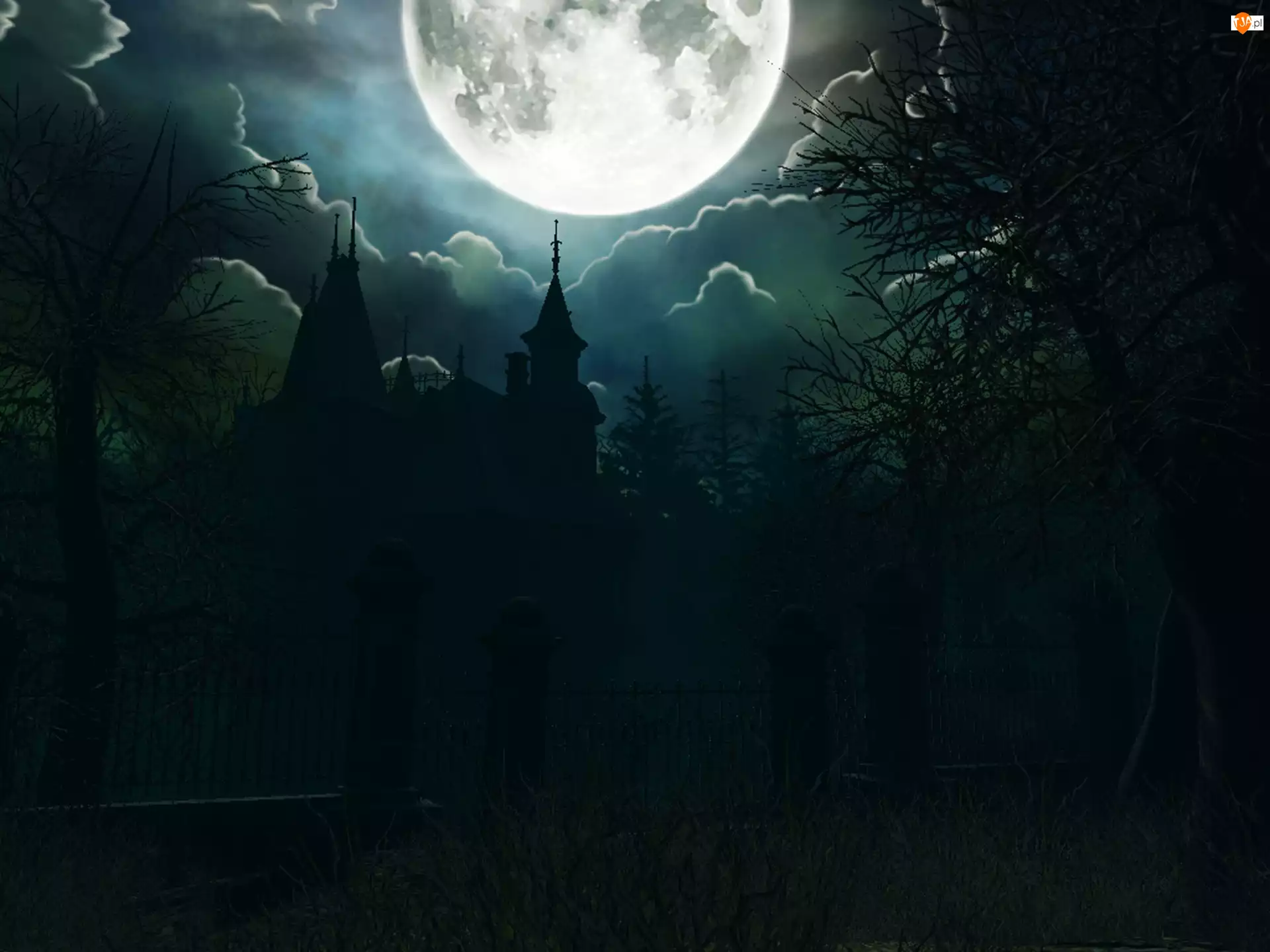 Chmury, Księżyc, Zamek, Mrok, Drzewa