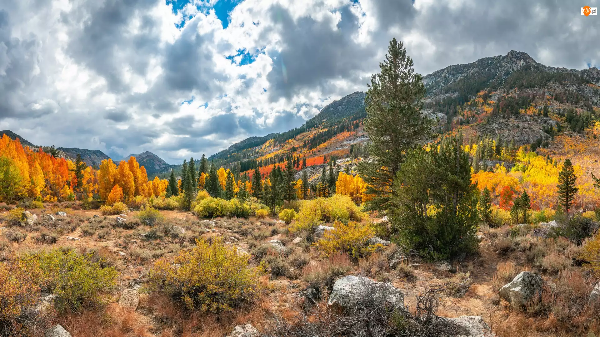 Chmury, Las, Drzewa, Skały, Kalifornia, Stany Zjednoczone, Jesień, Bishop Creek, Góry, Kamienie