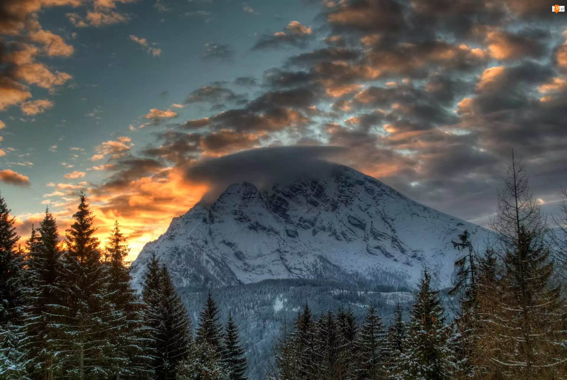 Chmury, Las, Zachód, Zima, Słońca, Góry