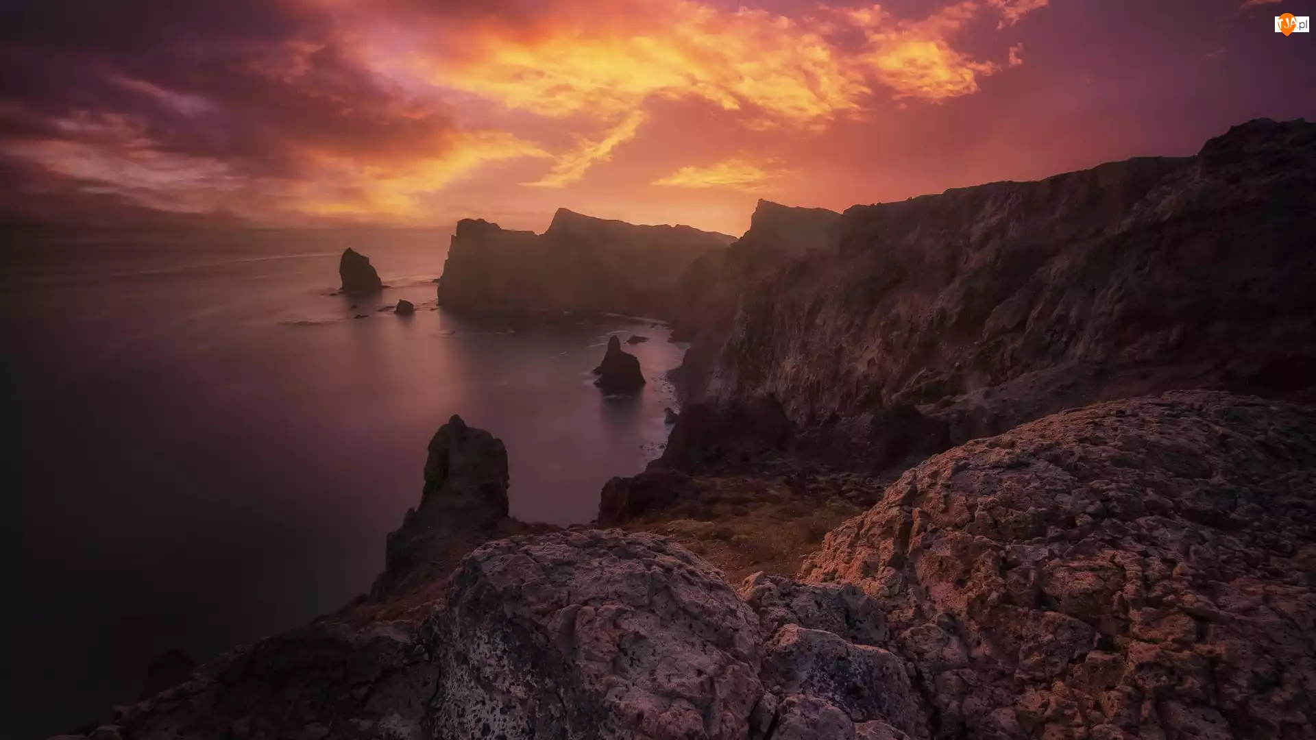 Chmury, Morze, Skały, Madera, Wybrzeże, Zachód słońca, Portugalia, Klify