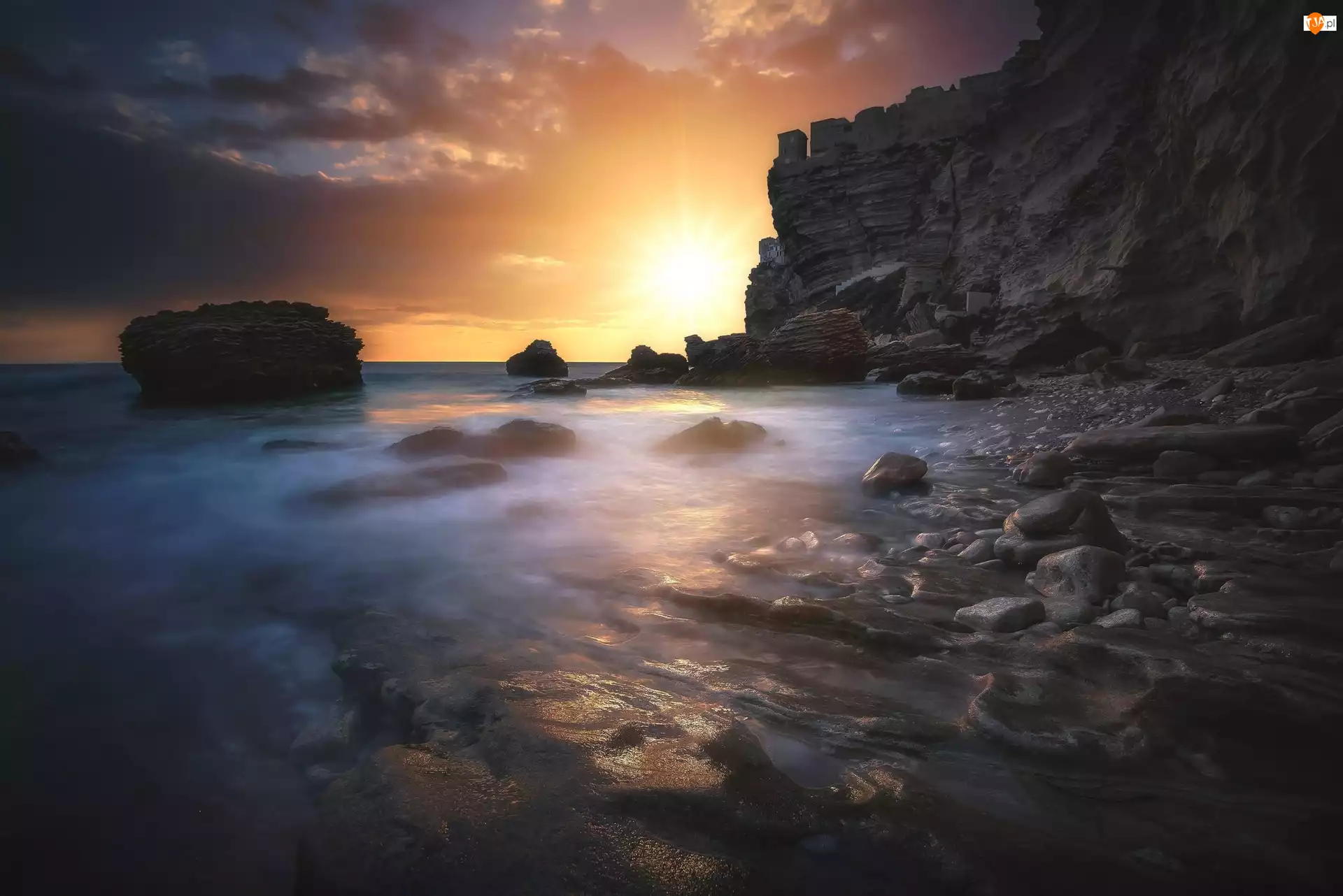 Chmury, Morze, Skały, Zachód słońca, Kamienie