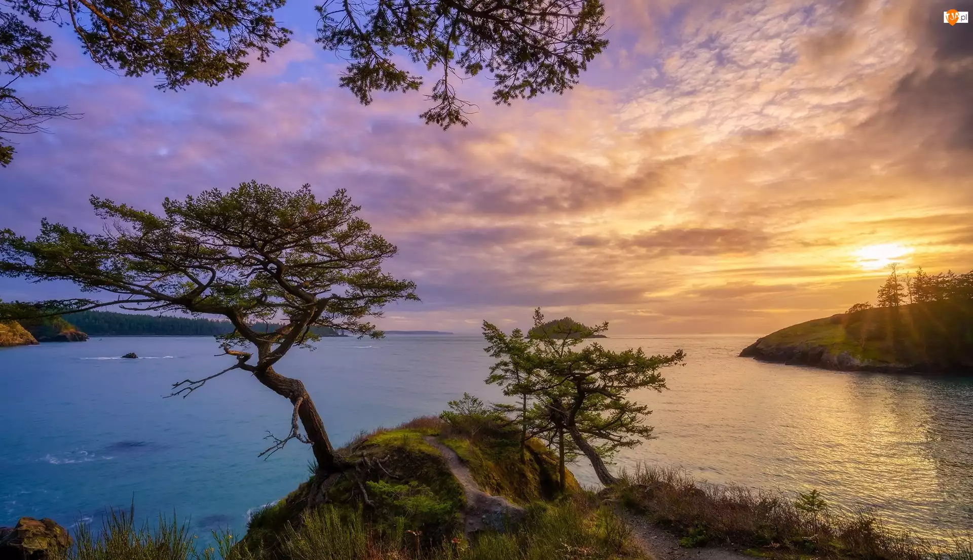 Chmury, Morze, Zachód słońca, Drzewa, Skała