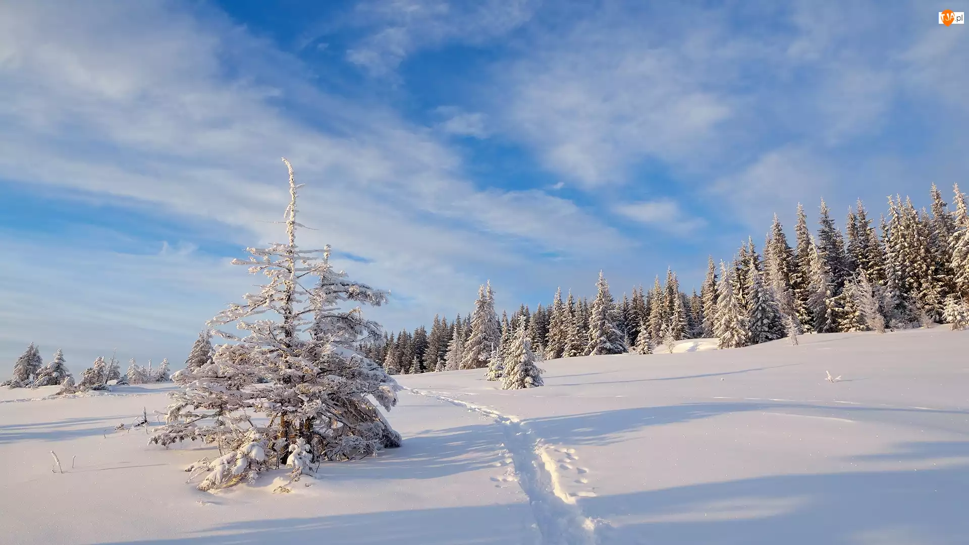 Las, Zima, Śnieg, Chmury, Świerki, Ścieżka