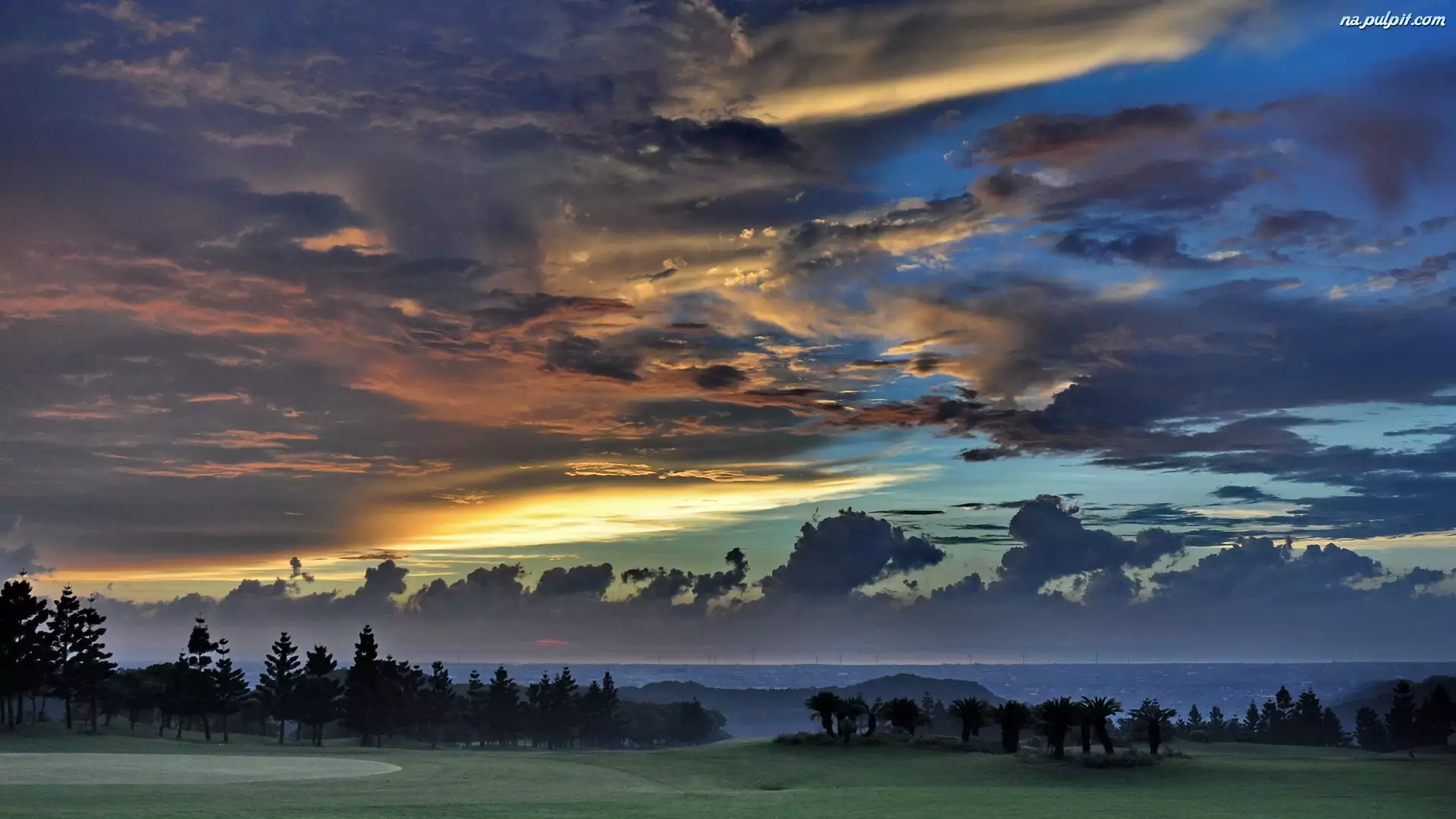 Chmury, Niebo, Zachód, Drzewa, Słońca