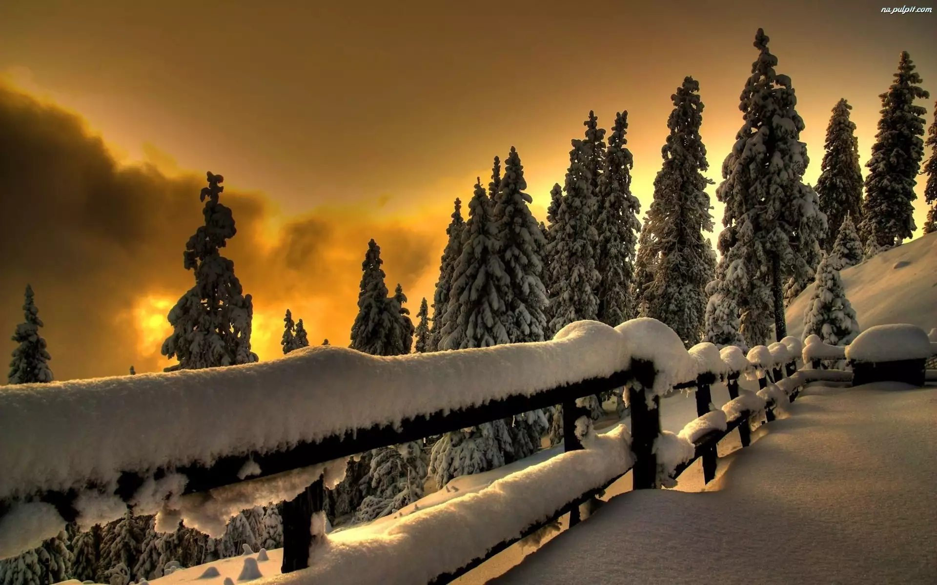 Chmury, Ośnieżony, Zachód, Taras, Słońca, Zima