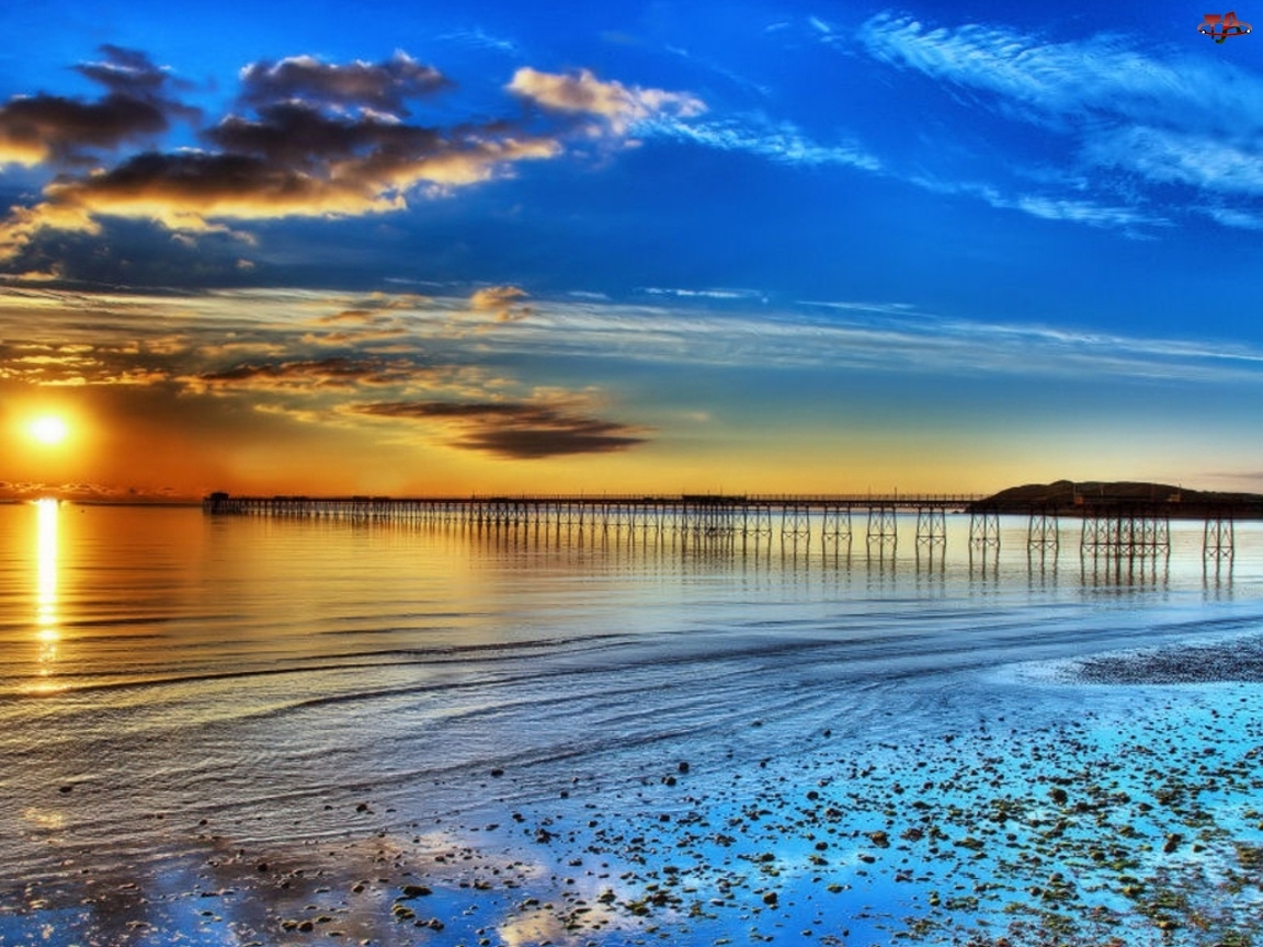 Chmury, Plaża, Zachód, Molo, Słońca, Morze