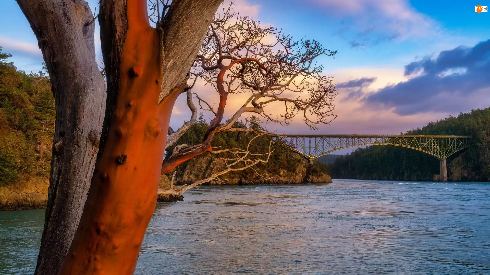 Chmury, Waszyngton, Drzewa, Deception Pass, Las, Most, Deception Pass Bridge, Stany Zjednoczone, Cieśnina