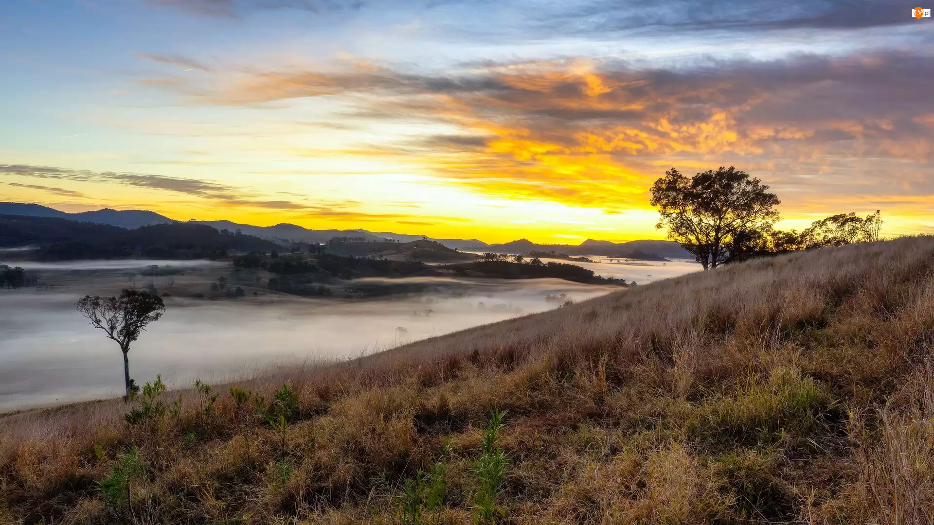 Chmury, Wzgórze, Zachód słońca, Mgła, Drzewa