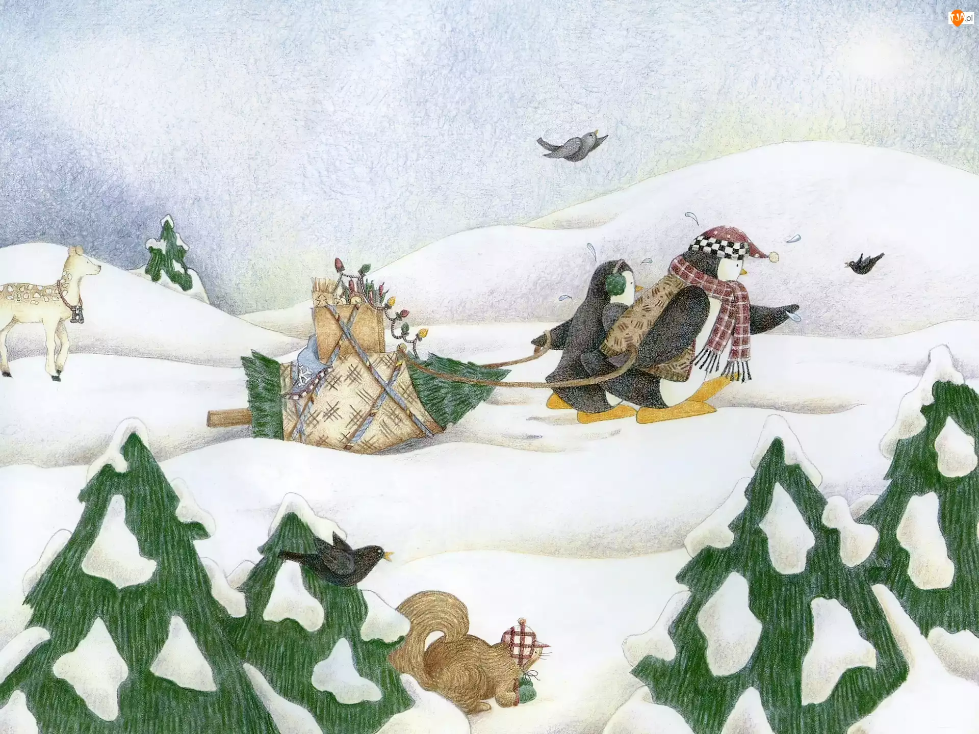 Choinka, Zima, Pingwiny, Śnieg, Sanie
